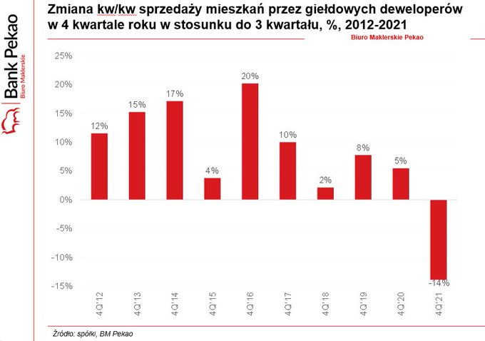 Попит на купівлю власного житла у Польщі у четвертому кварталі 2021 року різко впав через підвищення процентних ставок за кредитами. Порівняно із третім кварталом за останні три місяці року рівень продажу нерухомості знизився на 14%.