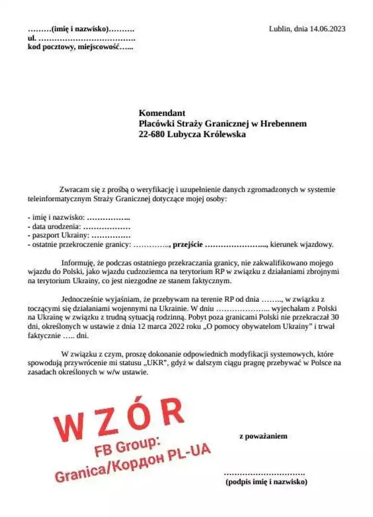 - У змісті листа вкажіть дату першого прибуття в країну на підставі “Спецзакону” дату виїзду в Україну та кількість днів перебування за межами Польщі, а також причину виїзду.